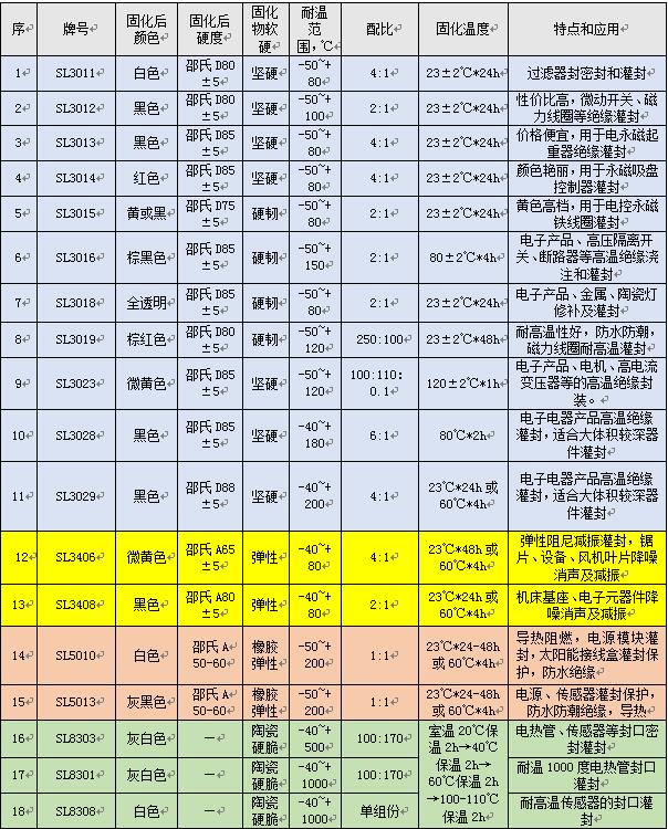 種類繁多的灌封膠又如何選擇呢?作為灌封膠的使用單位需要查看哪些性能數(shù)據(jù)才能對(duì)選擇灌封膠有幫助呢?下表是世林膠業(yè)在灌封膠方面的產(chǎn)品,可供您選擇參考,這里列舉的產(chǎn)品種類很多,功能也各不相同,如果您還有其他的特殊要求也可以和世林的工廠技術(shù)人員進(jìn)行交流,只有清楚知道您的實(shí)際用膠需求,我們才能給您提供全套的灌封用膠的解決方案。