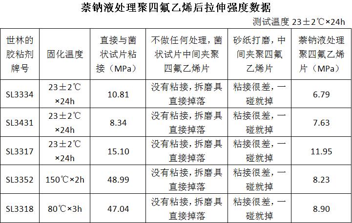 1.經(jīng)萘鈉液處理之后的5種膠粘接強(qiáng)度明顯要高于不做處理的,至于這五種種環(huán)氧膠的粘接對(duì)比此數(shù)據(jù)可能存在一定的偏差,目前就測(cè)試后的數(shù)據(jù)來看是SL3317最好。因?yàn)橛行┠>叩倪吘墰]有與PTFE粘到一起。