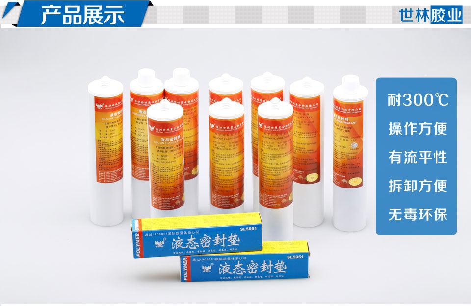 株洲世林膠業(yè)有一款SL5051耐300度液態(tài)密封膠,它是單組份有機硅密封膠,適用于飛機、汽車、摩托車等發(fā)動機、水泵、閥門、齒輪箱、減速箱、真空泵、空壓機等有關結合面,密封效果好,,耐水、耐汽油、耐機油、耐老化、具有優(yōu)良的耐介質性能,室溫下即可硫化,使用起來非常方便。使用溫度為-60℃~+300℃,短時可達+350℃。目前已大批量的使用在了汽車發(fā)動機制造廠和航空發(fā)動機上。