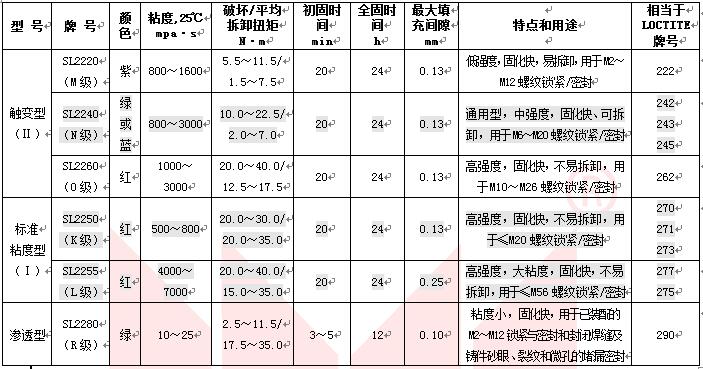 根據(jù)使用要求,如連續(xù)工作溫度、螺栓大小、所接觸的化學(xué)介質(zhì)、環(huán)境條件、是否經(jīng)常拆卸以及螺栓螺母材質(zhì)等。您可從厭氧膠的強(qiáng)度、工作溫度、粘度、固化速度、大填充間隙中合理選取不同牌號。